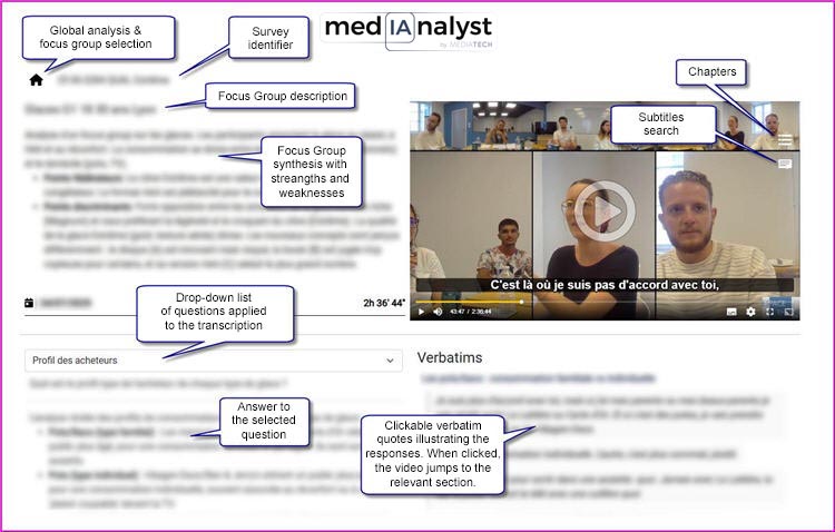 AI is involved at several levels: It performs automatic speech-to-text transcription regardless of the languages spoken or used for the analysis; It identifies different speakers (diarization), summarizes their statements, synthesizes entire discussions, compares several interviews or focus groups, and answers the specific questions posed by the study.